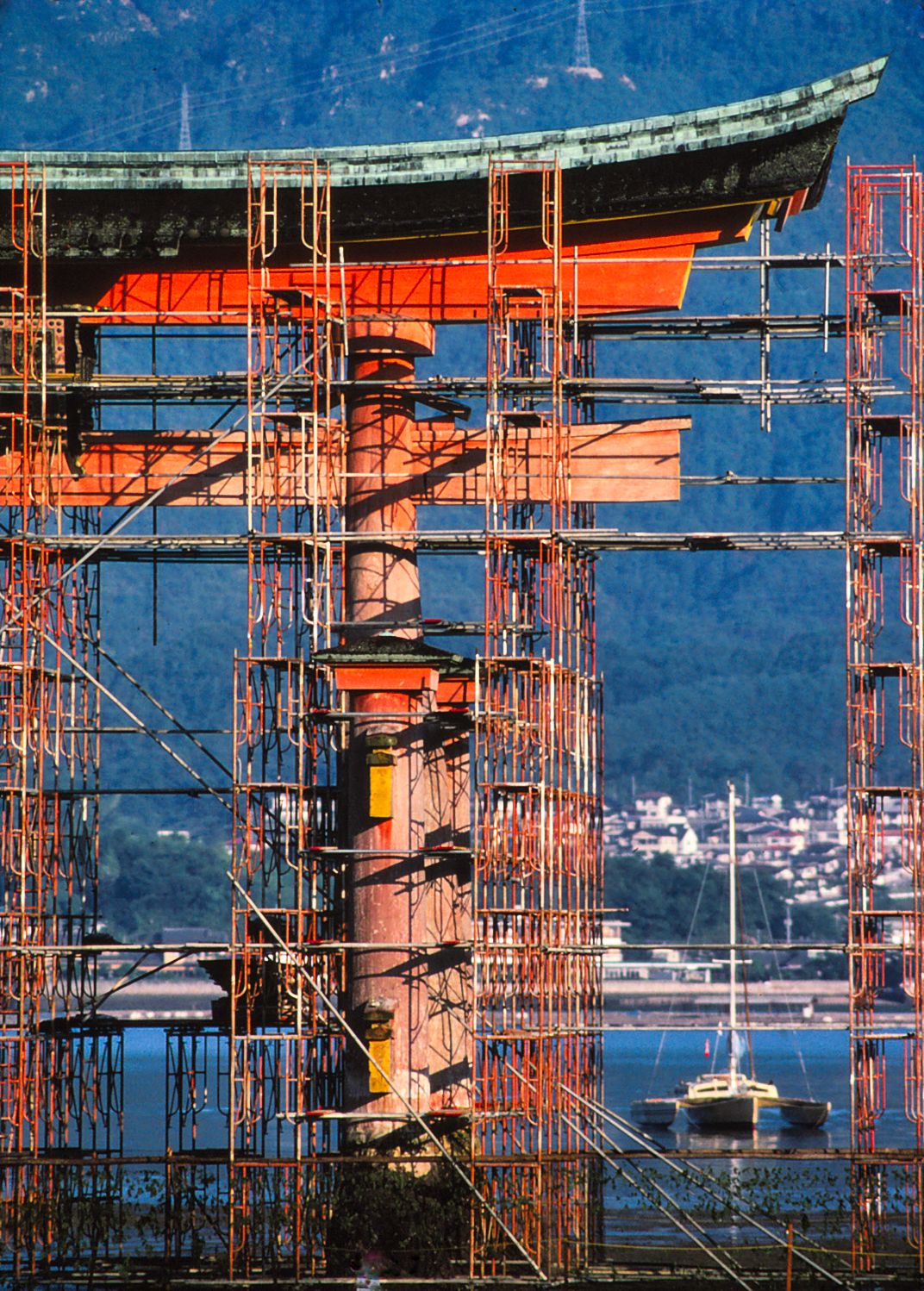 Celerity anchored off ancient O'torii under repair at Miyajima Island, Japan -(R) Will Thomas photo