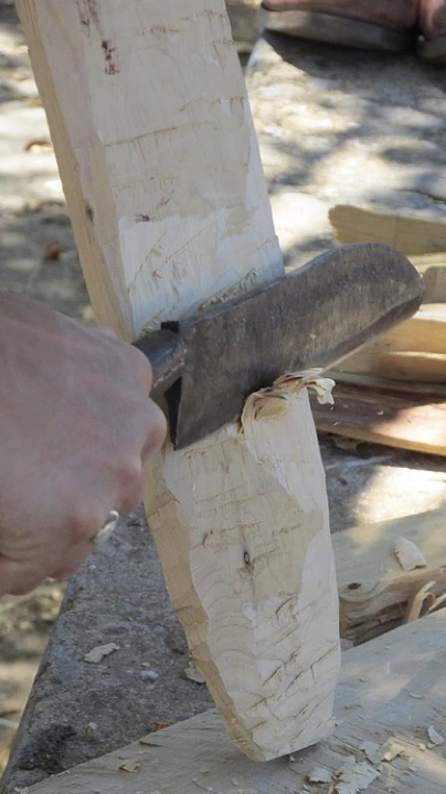 Using a stone tool, Rose puts the finishing touches on her paddle -P. Farrance photo