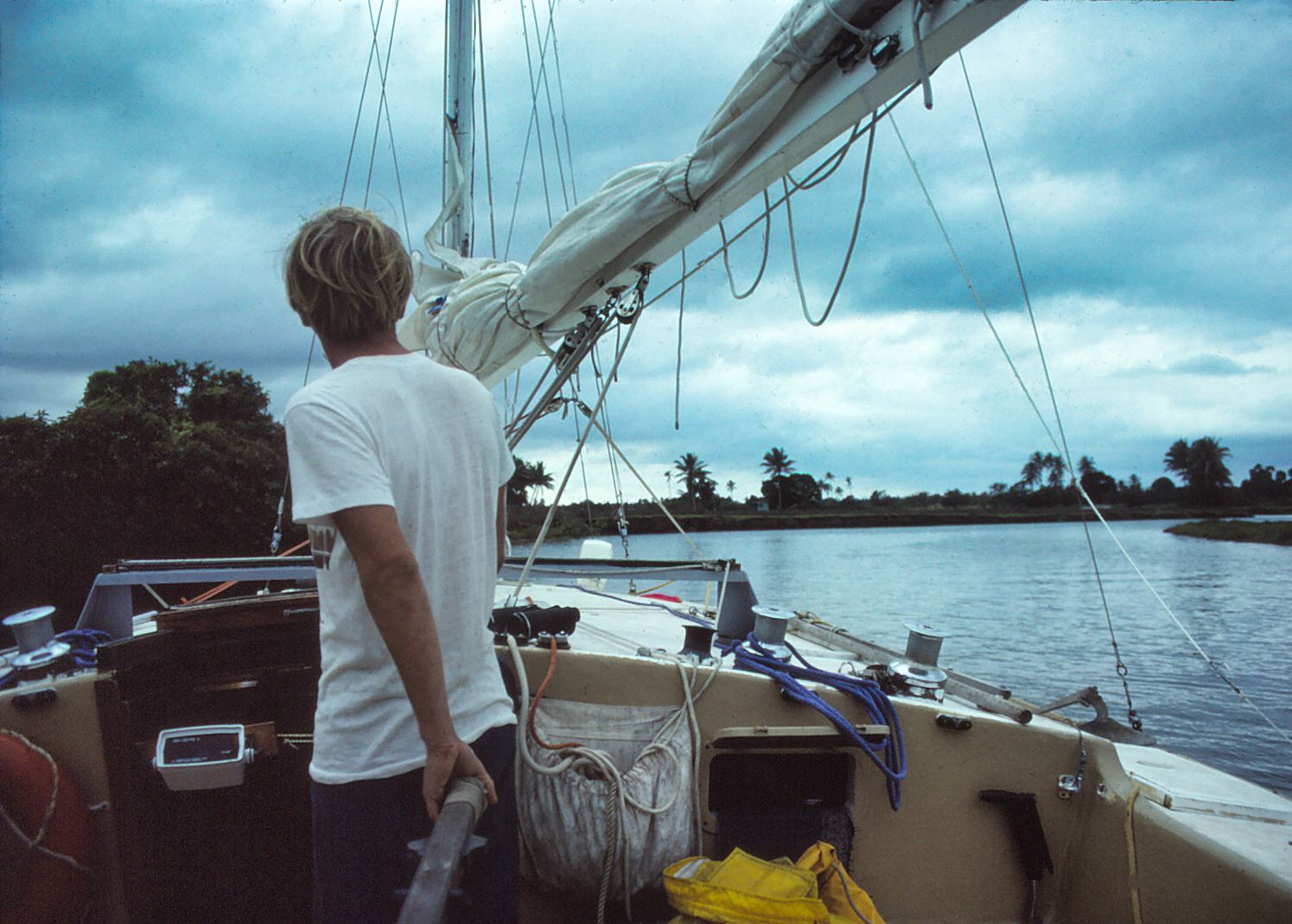 On the track of early Pacific navigators, the author helms Celerity up Fiji's Rewa River -Thea Mortell photo